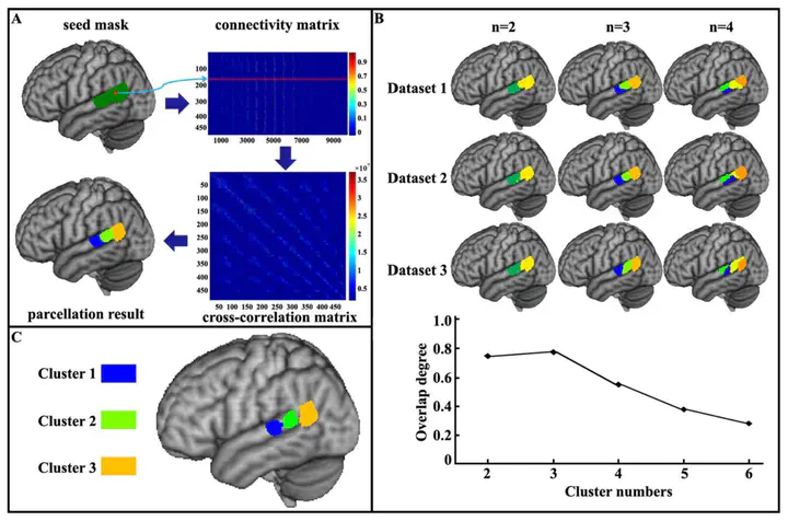 pSTG parcellationWernicke’s area is one of the most important language regions and has been widely studied in both basic research and clinical neurology. However, its exact anatomy has been controversial. In this study, we proposed to address the anatomy of Wernicke’s area by investigating different connectivity profiles. First, the posterior superior temporal gyrus (STG), traditionally called “Wernicke’s area”, was parcellated into three component subregions with diffusion MRI. Then, whole-brain anatomical connectivity, resting-state functional connectivity (RSFC) and meta-analytic connectivity modeling (MACM) analyses were used to establish the anatomical, resting-state and task-related coactivation network of each subregion to identify which subregions participated in the language network. In addition, behavioral domain analysis, meta-analyses of semantics, execution speech, and phonology and intraoperative electrical stimulation were used to determine which subregions were involved in language processing. Anatomical connectivity, RSFC and MACM analyses consistently identified that the two anterior subregions in the posterior STG primarily participated in the language network, whereas the most posterior subregion in the temporoparietal junction area primarily participated in the default mode network. Moreover, the behavioral domain analyses, meta-analyses of semantics, execution speech and phonology and intraoperative electrical stimulation mapping also confirmed that only the two anterior subregions were involved in language processing, whereas the most posterior subregion primarily participated in social cognition. Our findings revealed a convergent posterior anatomical border for Wernicke’s area and indicated that the brain’s functional subregions can be identified on the basis of its specific structural and functional connectivity patterns.