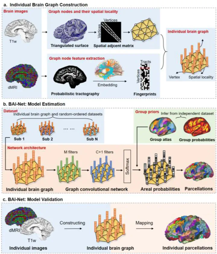 Schematic diagramIndividualized human cerebral cartography has drawn considerable attention in neuroscience research. Many challenges remain, mainly due to large individual variability in brain morphology, connectivity and function. We developed a new tool called brain atlas individualization network (BAI-Net) that automatically parcels individual cerebral cortex into segregated areas using structural and diffusion MRIs. The presented method integrates the group priors into the loss function of graph convolution network, learns the connectivity context of anatomical fingerprints for each area, and consequently provides reliable and explainable individual-specific topography across multiple sessions and different scanners. The BAI-Net model not only captures high variations across individual brains while maintaining high consistency with the priors in the group level, demonstrating high heritability in a twin study, but also shows high associations with behaviors in a cognitive battery. Our method shows high potentials in the field of precision medicine including the diagnosis and treatment of neurological disorders.
